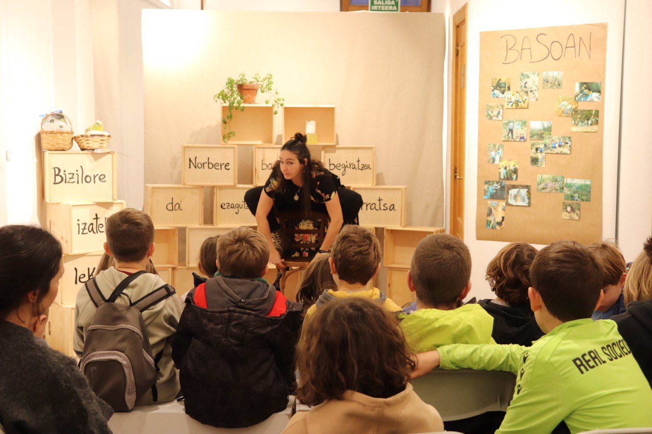 Bizilore eskolak antolatuta, Odei Arregi ipuin kontalari azkoitiarrak Kamaleoiaren azala ipuina kontatu zuen atzo, asteartea, herriko plazako Portaleburu erakusketa aretoan. Dozenaka lagun elkartu zen Arregiren kontakizuna bertatik bertara jarraitzeko, tartean haurrak eta horien gurasoak nahiz aiton-amonak.