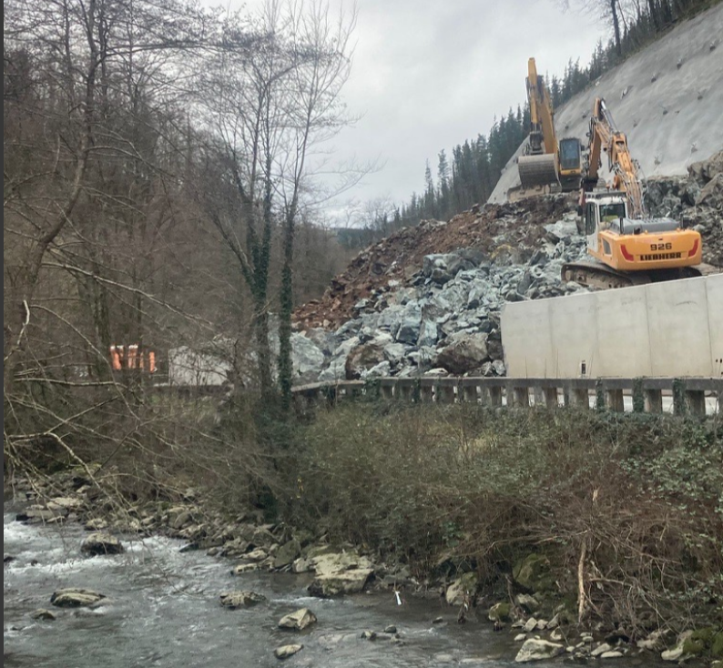 Harriak, lurra eta babes hesiaren zatiak erori dira errepidera, eta ibaiaren ondoko petrila hautsi dute horiek. Ondorioz, errepidea itxita egon da hainbat orduz, eta eremua libratzeko lanetan aritu dira arratsaldean. Eguna amaitu aurretik zabaldu dute berriz errepidea.