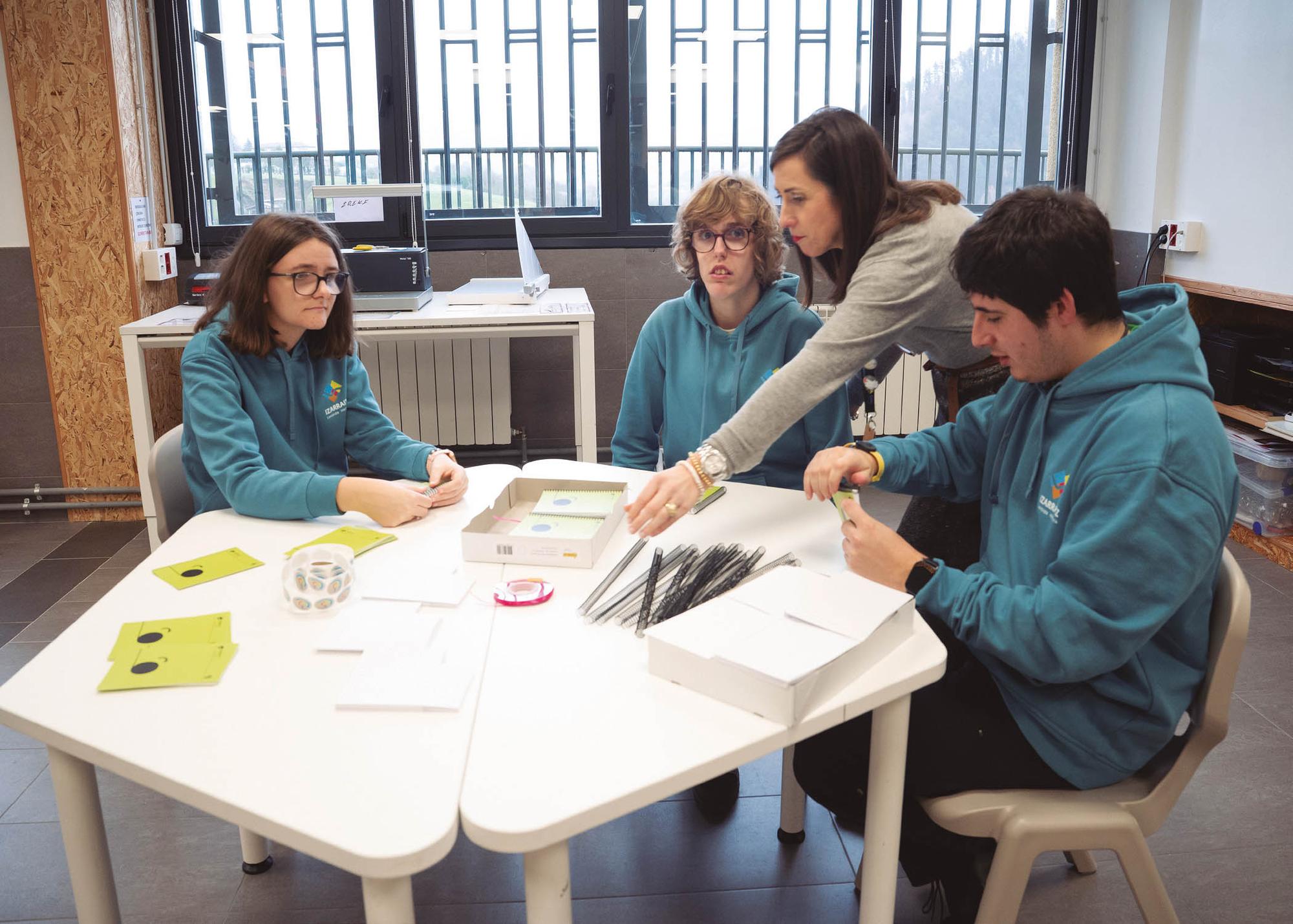 Ikasgelan, bakoitzak bere eserlekua zein mahaia dauzka, eta lanerako gune bat ere bai. Koadernoak sortzen ari dira, eta zulagailuz, orriz, kartulinaz, eraztunez edota koloretako zintaz beteta daude mahaigainak. Horrez gain, administrazioarekin loturiko bestelako lanak ere egiten dituzte; fakturekin edota albaranekin aritzen dira, besteak beste, lanean. Lizarraldek dioenez, administrazio arloan egiten dituzten "keinu txikiek" asko erraztuko lukete ikasleen lana: "Fakturak eta albaranak kolore desberdinetako karpetetan jasotzea guretzat ez da ezer, baina aniztasun funtzional kognitiboa duen batentzat bai".