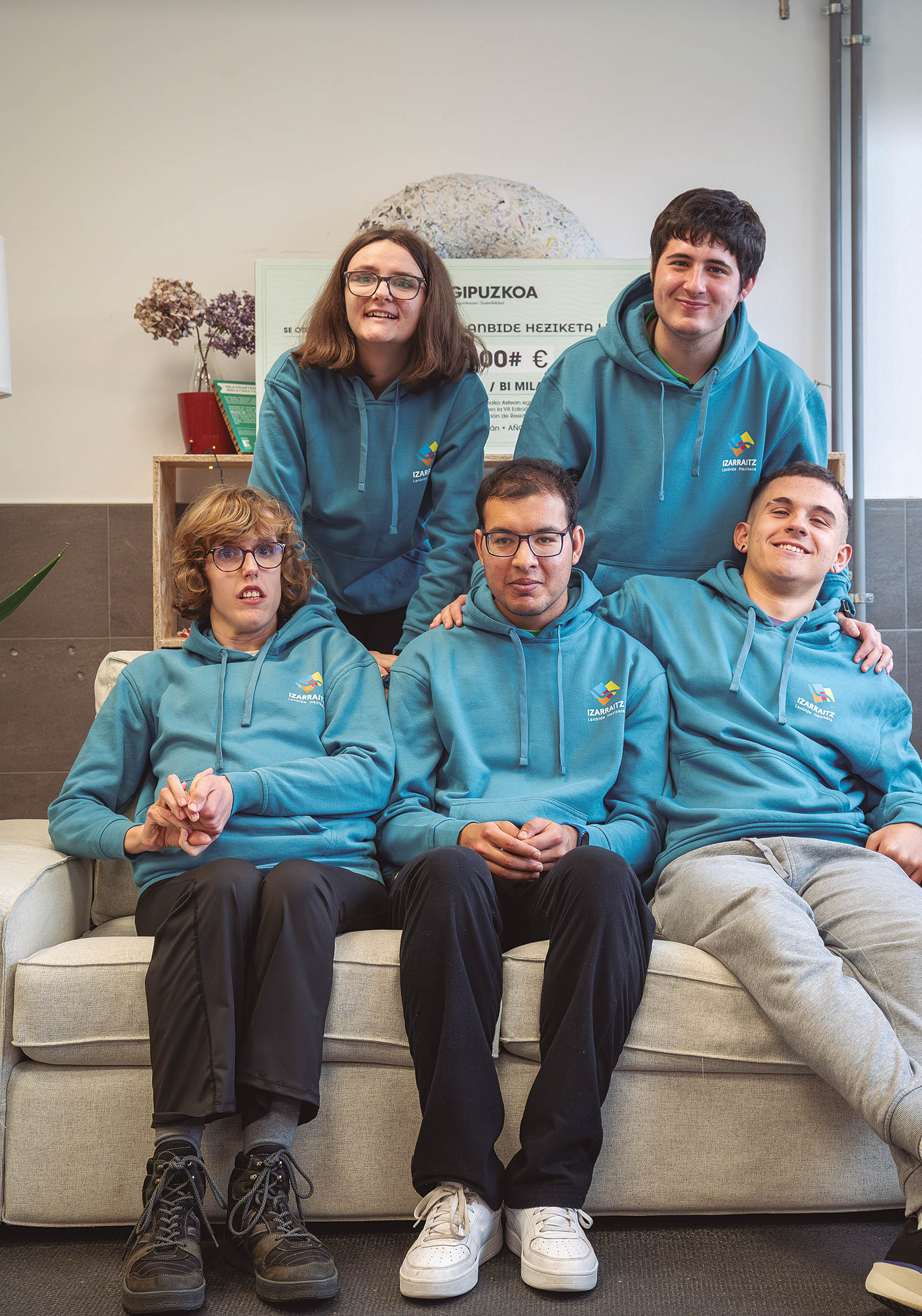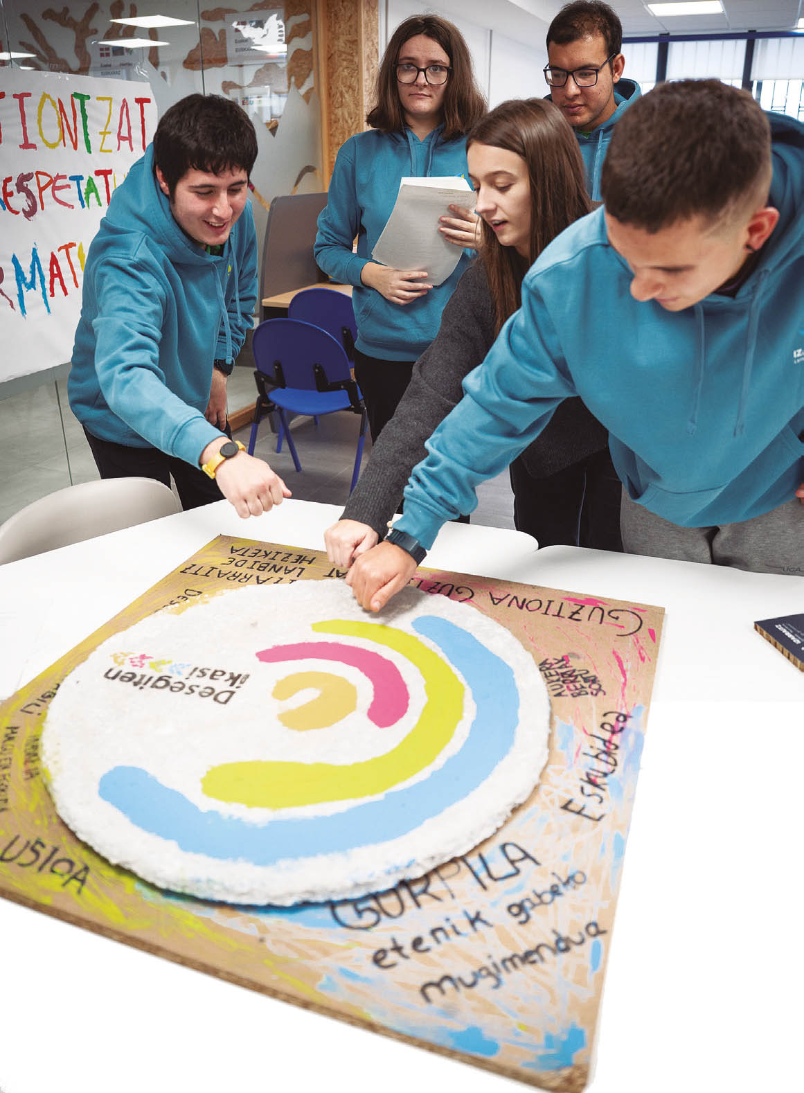 Izarraitz Lanbide Heziketako atea zabaldu du Miren Oterok (Azkoitia, 1978), eta sartu orduko lau gezi handi nabarmentzen dira bulegoaren ezkerraldean, bakoitza kolore banatakoa: marroia, arrosa, urdina eta berdea. Geziek abian duten proba pilotuari egiten die erreferentzia: Hasierako Lanbide Heziketa Malgua eta Egokitua. Hamazazpi heziketa ziklo eskaintzen dituzte eskolan, guztira, 30 taldetan banatuta eta 74 langilerekin. Ikasleak, berriz, dozenaka dira, eta aurten batu direnetako bost dira Luken Orbegozo (Azkoitia, 2008), Nora Cagigal (Azpeitia, 2002), Maitane Beloki (Azpeitia, 2003), Arturo Arellano (Azkoitia, 2006) eta Adrian Dan (Azpeitia, 2004). Izarraitz Lanbide Heziketak eta Marea Urdina elkarteak elkarlanean diseinatu duten proiektuko ikasleak dira bostak. 2023an ekin zioten diseinuari, eta dagoeneko martxan da; heziketa arautuan ez dago txertatuta, baina abiarazte fasean dagoen proba pilotua da lau ikasturtetan banaturiko zikloa. Aniztasun funtzional kognitiboa duten ikasleak bi irakaslerekin eta hezitzaile batekin aritzen dira eguneroko jardunean. Cagigalek aurreratu du "oso gustura" joaten dela ikastetxera.