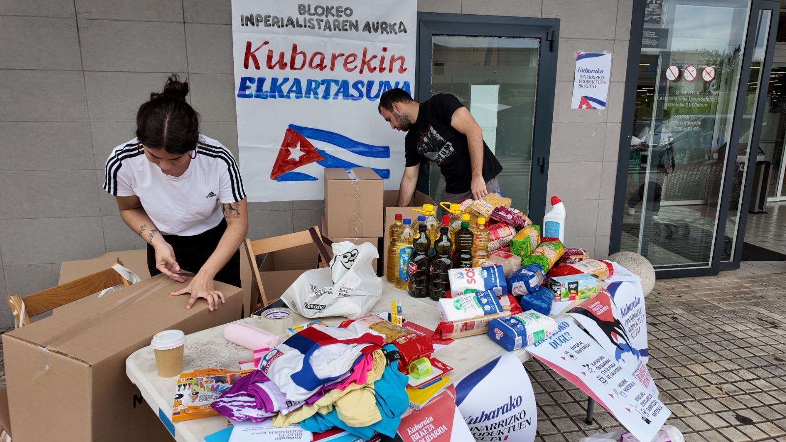 Kubara bidaltzeko oinarrizko produktuak bildu dituzte Euskal Herriko Kontseilu Sozialistak (EHKS) eta Ikasle Antolakunde Sozialistak (IAS), Euskadi-Cuba elkartearekin elkarlanean. Blokeo inperialistaren aurka, Kubarekin elkartasuna lelo hartuta, pasa den astean herriko ikastetxeetan bildu zituzten produktuak eta atzo, larunbata, hainbat saltokitan jarri zituzten materiala biltzeko mahaiak.