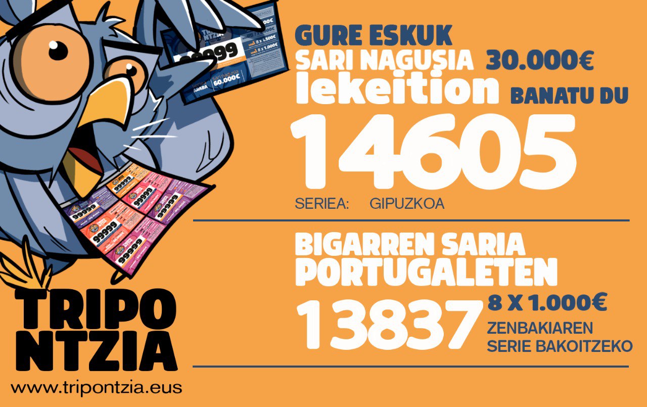 Gure Eskuk banatu du Tripontziaren saria. Sari nagusia 14.605 zenbakiaren 'Gipuzkoa' serieari tokatu zaio, eta Lekeition (Bizkaia) saldu da. Zenbaki eta serie hori duenak 30.000 euroko saria jasoko du.
