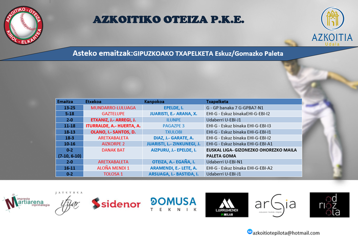 Joan den astean jokatu zituzten Oteiza elkartekoek txapelketako aurreneko pilota partidak. Hona hemen horien emaitzak: