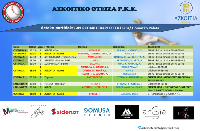 Oteiza pilota elkarteko kideek etxeko partidak ostegunean, ostiralean eta igandean jokatuko dituzte, Gurea frontoian. Eskuz binakako eta paleta gomako partidak ikusteko aukera izango dute pilotazaleek, frontoian.