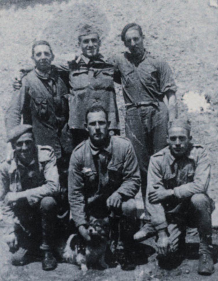 Basarri –goian erdian– trabajadoreetako lagunekin, 1939an. (Utzitakoa)